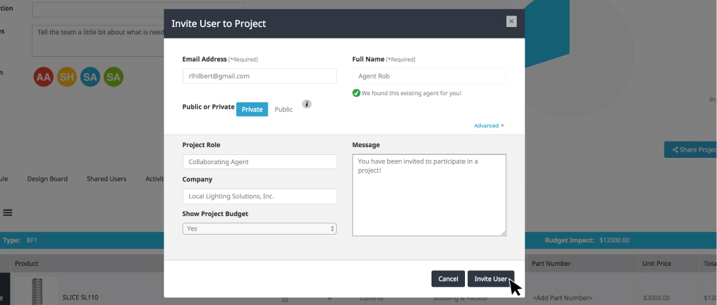 Once you have included all information, simply click “Invite User” and an email will be sent to that user from your Lighting Exchange account including your Agency Name, Personal Name and Project Name.